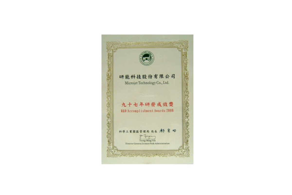 研能近年來積極的發展噴墨頭及噴墨列印引擎,在研發投入經費、專利數目以及衍生效益均逐年遞增中。研能科技獲得新竹科學園區管理局頒發之97年度「研發成效獎」,肯定研能科技長期投入的研發成果,進一步展開自我的專利佈局。